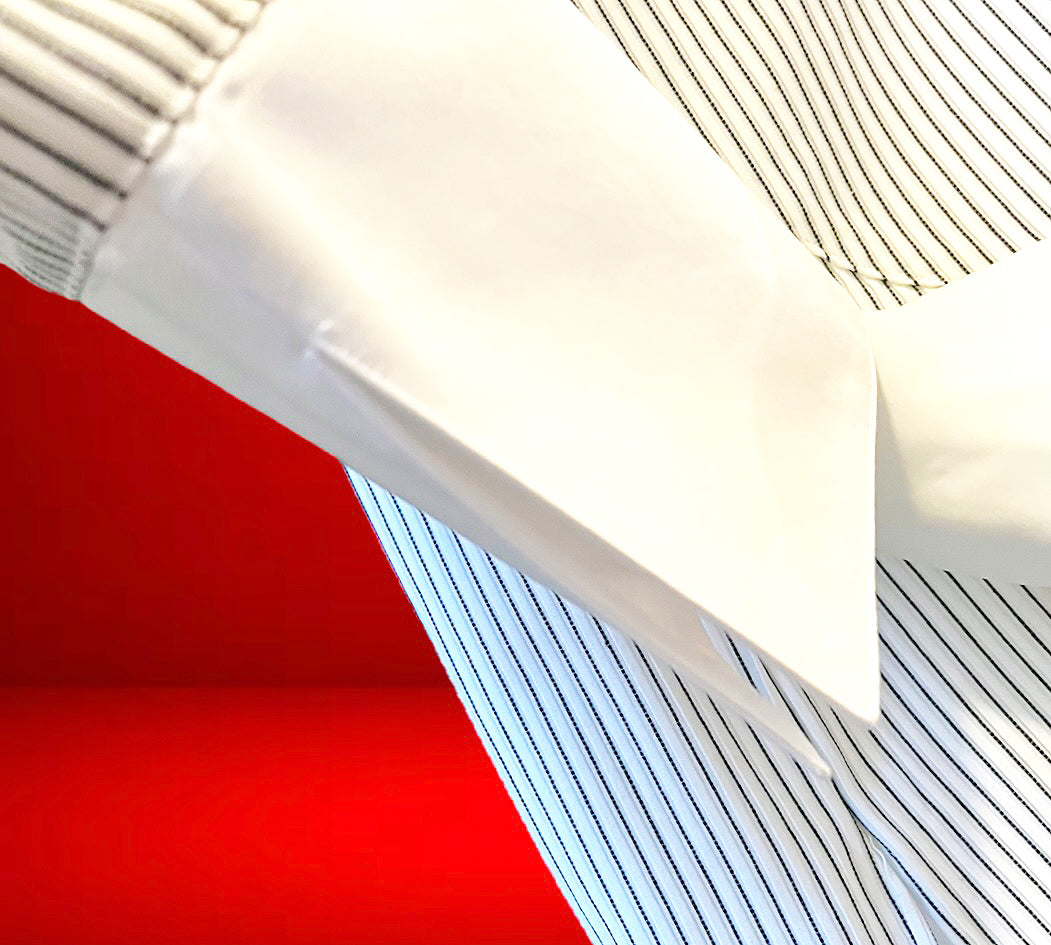 This beautiful white fabric with razor pleated black stitching is imported from Switzerland and exclusively ours! An extraordinary hand and a gorgeous drape.