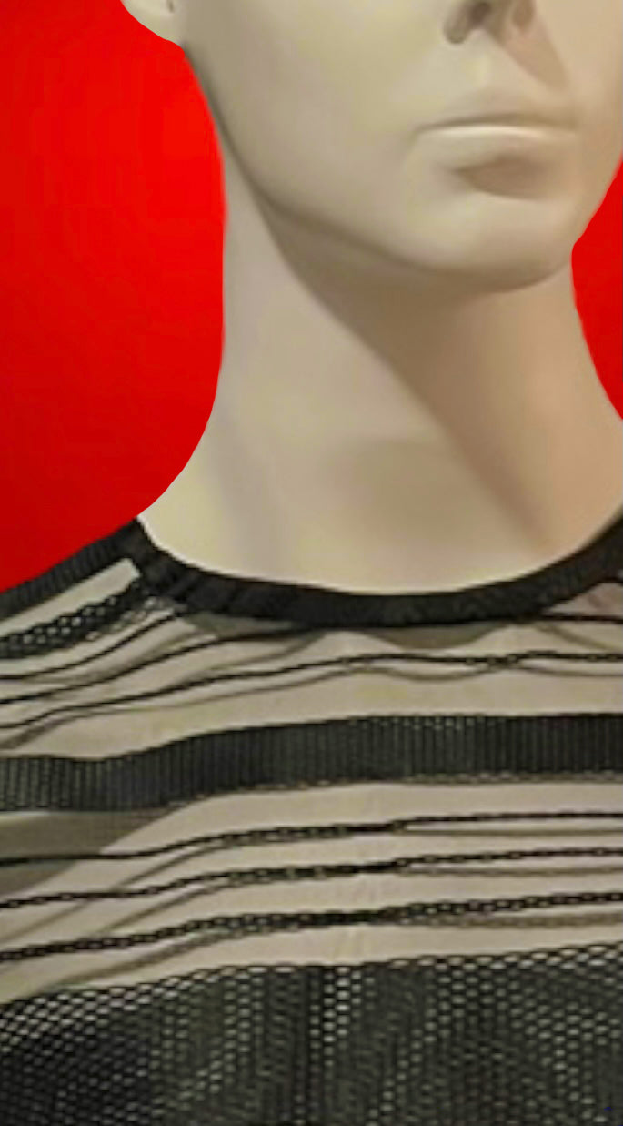 Black organza Couture blouse with mandarin collar and Mark’s signature voluminous sleeve. 2 ways back zipper, signature French cuff with covered buttons.
