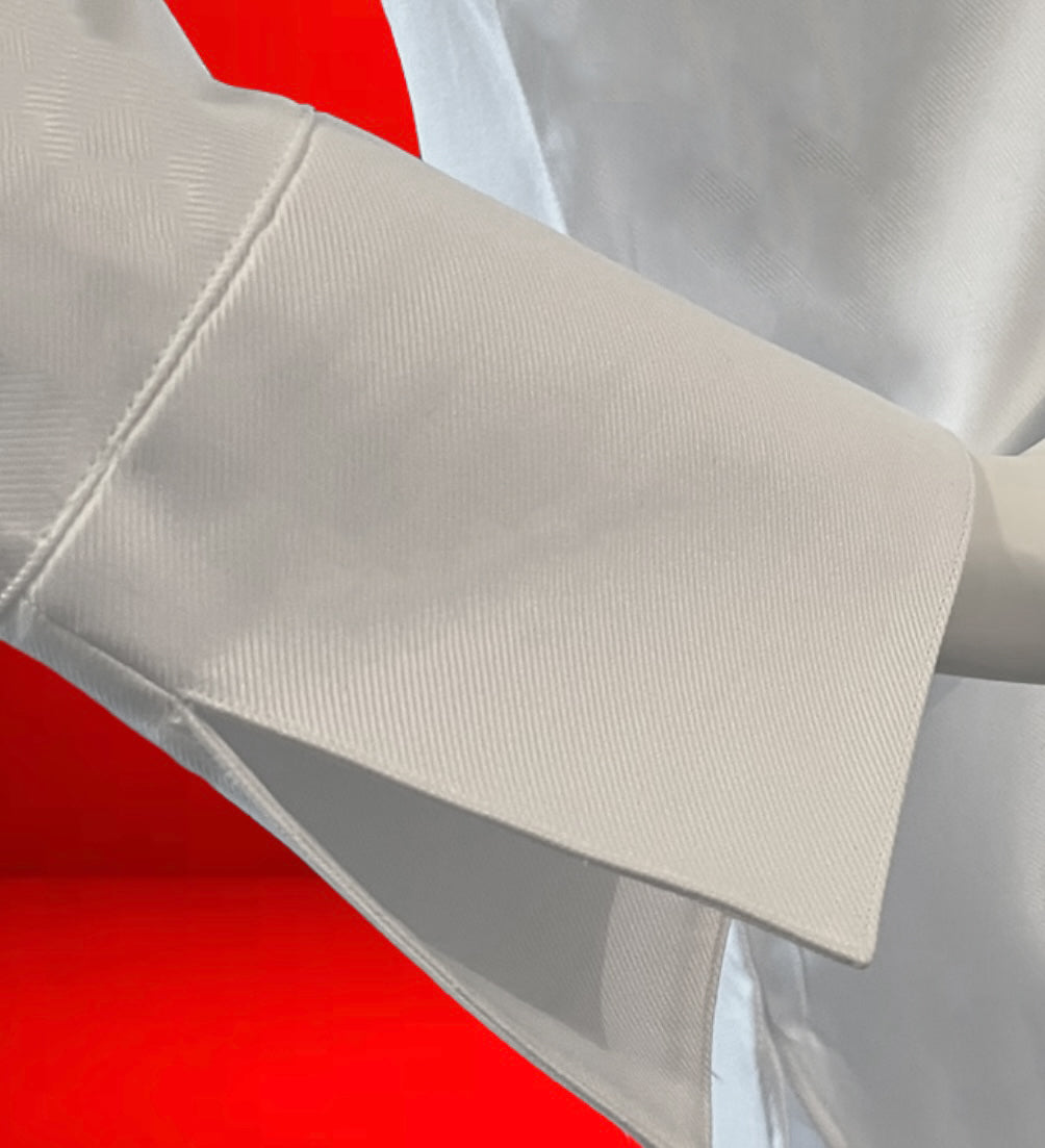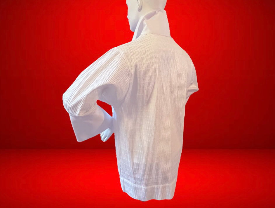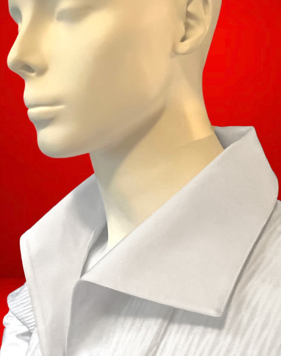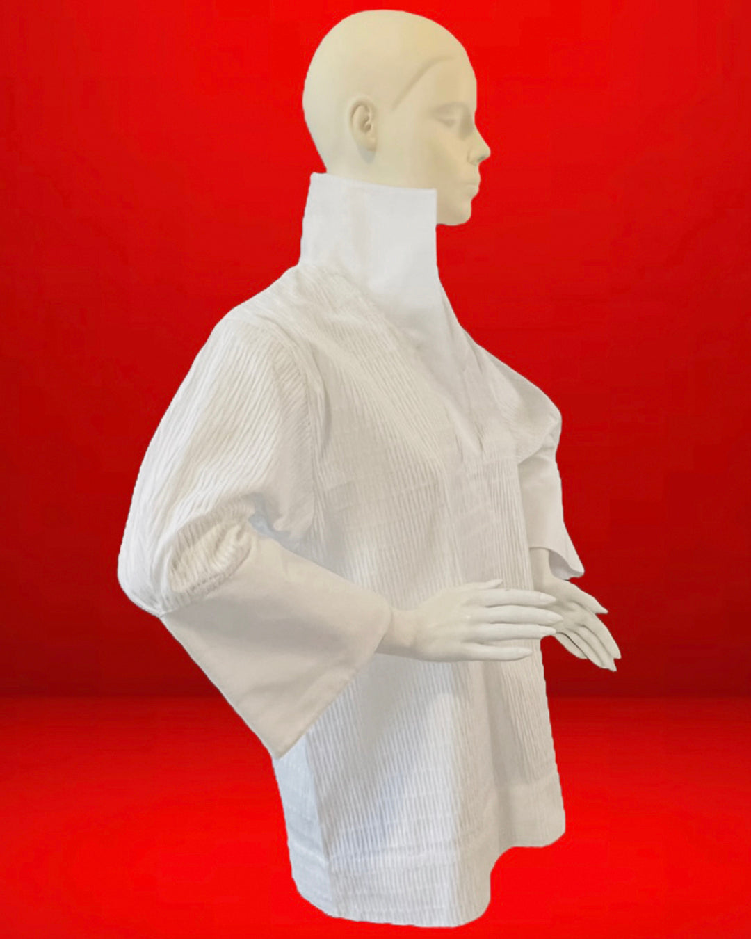 Featuring that beautiful movement that Mark is famous for, in the body that allows for a relaxed and more comfortable fit. A hand made structured Couture statement collar and our signature tulip cuff.
